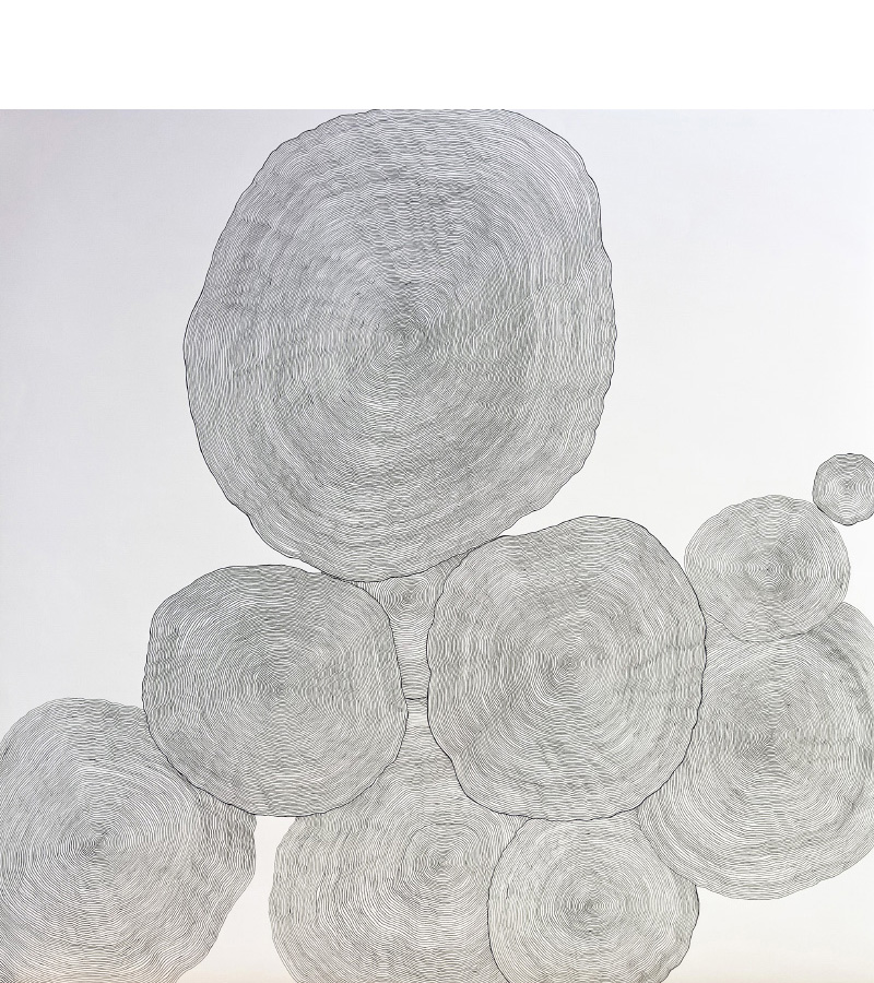 Adams’ Concrete & Revolutions brings together two distinct yet interconnected bodies of work: intricate drawings of repeated organic revolutions and sculpture built from discarded freeway concrete and the artist’s own detritus. The work invites contemplation on the movement of time, the power of repetition, and transformation of the mundane.